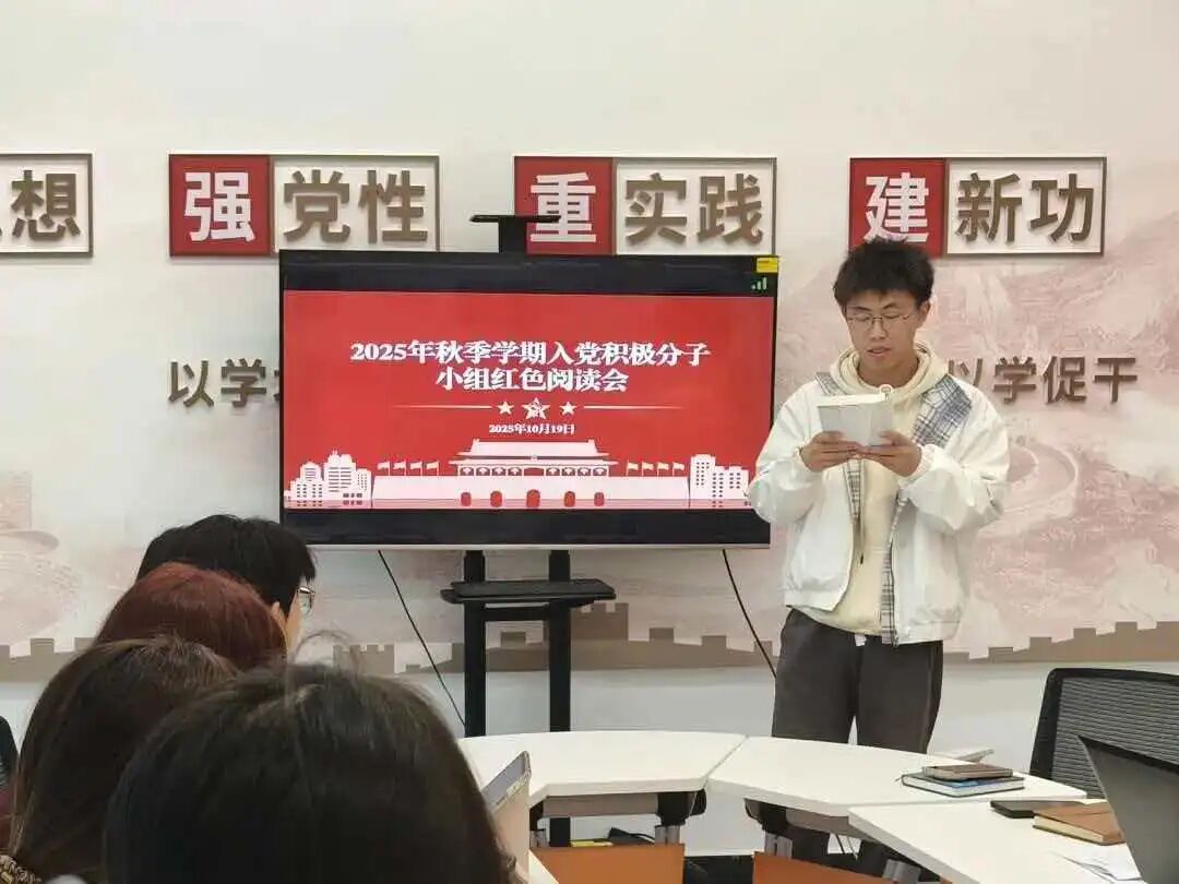 为深入学习贯彻习近平新时代中国特色社会主义思想,进一步加强入党积极分子的思想政治教育,筑牢理想信念根基,10月19日,2025年秋季学期入党积极分子开展“学史鉴今·砺行致远”红色阅读会,小组成员全员参与,活动由组长韩泽渊主持。