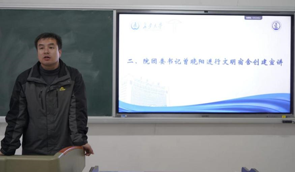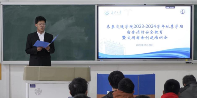曾晓阳对培训会进行总结并介绍文明宿舍创建指南。他指出消防安全尤为重要,需要同学们时刻牢记,防护意识不可无,尤其是各宿舍长要发挥好自己的作用,带头做好消防安全工作,监督宿舍成员遵守相关的规章制度,同时督促宿舍成员保持好宿舍卫生、营造良好的学习氛围,倡议同学们积极参与到文明宿舍的创建中。