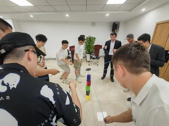 在大家熟悉一些常用表达后,紧张而有趣的小游戏环节拉开帷幕。首先进行“乒乓入杯挑战赛”,参赛成员须精准地将乒乓球投入杯中,现场的气氛异常热烈,欢笑声、加油声此起彼伏。此外,现场还组织了团队活动--“堆堡垒”,十名员工一队,大家齐心协力、共同协作,运用刚刚学会的常用语进行交流,以最快的速度堆建起“坚固的堡垒”。趣味小游戏不仅锻炼了大家的团队合作精神和良好的沟通能力,更在无形中增进了彼此之间的友谊与默契。
