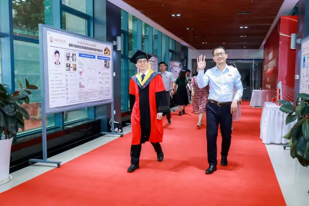 星光洒落大道,映照青春脚步。典礼前,公司为首届毕业生们铺设“星光大道”红毯走秀,以摄影形式定格青春瞬间。毕业生们在签名墙上签下自己的名字,记录四年青春记忆。连廊两旁,陈列公司优秀毕业论文海报,彰显科研风采,寄语未来梦想。