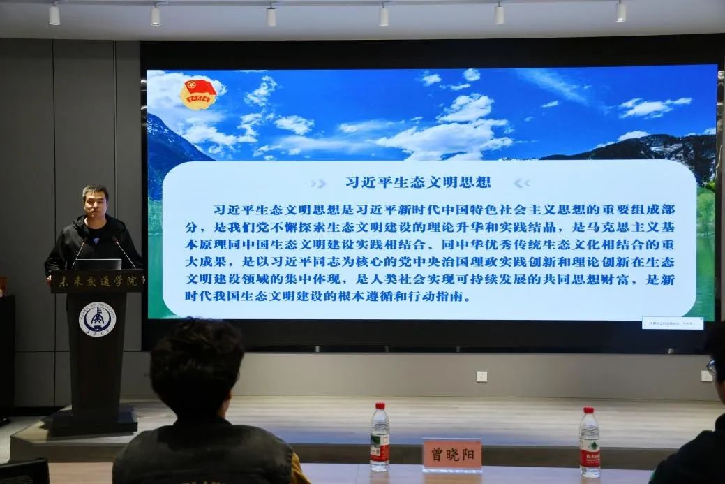 团课以秦岭违建别墅事件以及乌梁素海治理工作为引入点,直观展示了当前生态环境保护的重要性和紧迫性。曾晓阳带领与会成员共同学习习近平生态文明思想的主要内涵与价值,感悟总书记炽热的民生情怀,深入了解把握生态文明建设的历史规律、根本动力、发展道路、目标任务等重大理论课题意义。在理论指导实践环节,曾晓阳结合新疆阿勒泰地区自然保护协会在生态环境保护领域的事迹,详细讲述了协会成员放弃都市生活,投身家乡建设,助力当地珍稀物种保护工作的感人故事,强调了青年在生态文明建设中的巨大潜力和重要作用,鼓励团员青年以协会成员为榜样,积极投身绿色发展实践中去。