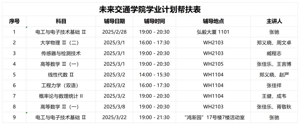 本次学业帮扶覆盖2022、2023、2024三个年级的全体公共课和专业课,志愿者对《传感器与检测技术》《大学物理 II (二)》《工程力学 (双语)》《高等数学 II (一)》等8门重难点科目进行“点面”形式辅导,精准对接员工的多元化学习需要与补考准备诉求,带领同学们详细梳理课程的重点知识,讲解考试的常见题型与答题技巧,锻炼同学们的解题思维与逻辑能力。无论是集体辅导还是个性化的一对一指导,志愿者均展现出极高专业热忱与敬业精神,为同学们提供了涵盖课程重点难点剖析、学习方法与技巧传授在内的全方位、定制化学习支持,有力保障其在补考中的成功通过率。