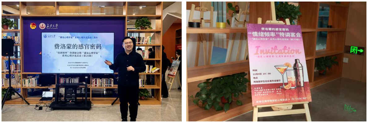 活动现场,往期“遇见心理学家”系列心理沙龙海报依次陈列,温馨茶歇区与主题打卡区引人驻足。现场师生彼此敞开心扉、交流鼓励,享受着这场自我觉察与社交互动的心理沙龙。