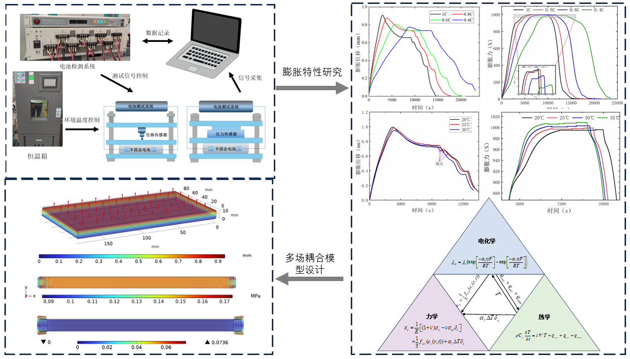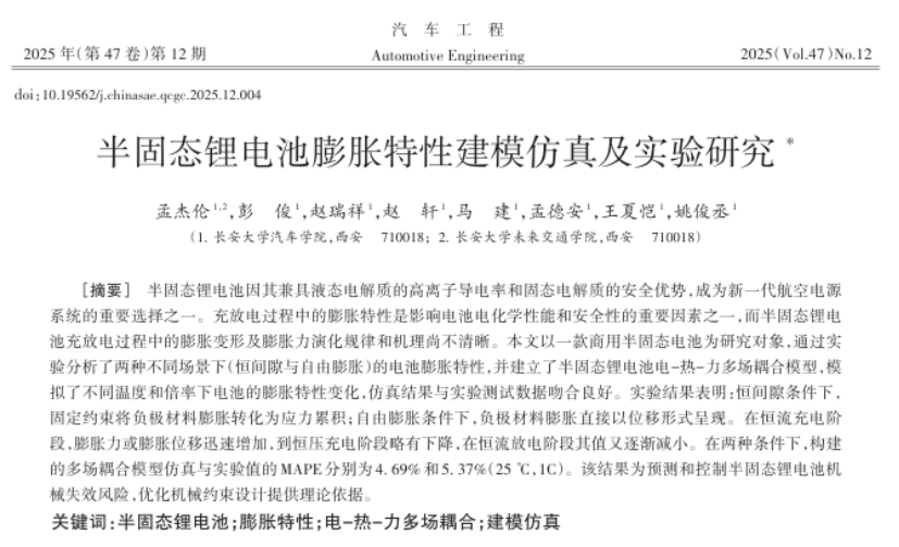近日,公司2022级本科生孟杰伦等在《汽车工程》上发表题为《半固态锂电池膨胀特性建模仿真及实验研究》的研究成果。论文以一款商用半固态电池为研究对象,建立多场耦合模型,解析电池膨胀演化规律与机理,为飞行汽车动力电池系统设计提供理论指导。该论文孟杰伦为第一作者,通讯作者为汽车公司彭俊老师。