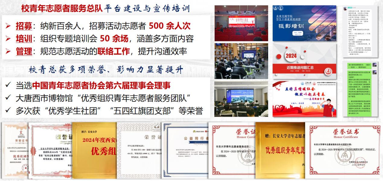 作为青年志愿者服务总队副主席,她坚持以高度的责任感和热情投入志愿者的招募、培训和管理工作中。为壮大志愿服务的队伍,她精心设计纳新宣传方案,走进宿舍、班级开展宣传,耐心讲解志愿服务的理念,累计纳新百余人;在校园歌手大赛、西部计划宣讲会等大型活动筹备期间,她招募志愿者500余人次;在校运动会期间,她主动组建并管理替补志愿者团队,两年共招募替补志愿者70余人次,确保每项活动背后都有可靠的支持。为进一步提升志愿者的综合素质,她组织专题培训会50余场,涵盖主持、礼仪、公文协作、摄影技巧等多方面内容。她还注重志愿团队凝聚力的培育,构建了团结互助、积极向上的志愿团队氛围。