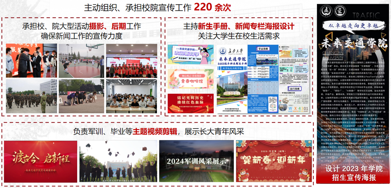 她密切关注公司的各项活动,主动组织、承担活动的摄影、宣传工作220余次,不断提升自身水平;她多次第一时间担任公司、公司的应急工作,包括深夜的推文制作、加急撰写活动稿件等,每次都能够确保认真、高效完成,她高度的集体责任感与真诚无私的奉献精神深深感染着身边每位同学。