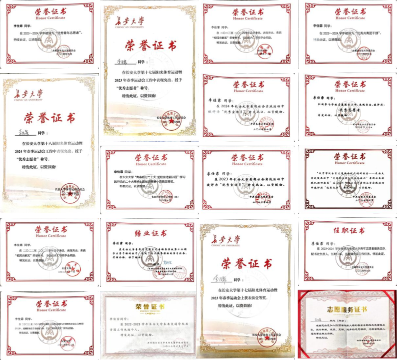 曾获“芙蓉学子·社会实践奖”(当年度同级员工唯一、全校仅2人)、校级优秀共青团干部、优秀青年志愿者、校园贡献奖等荣誉30余项,2024-2025学年荣获长大·卓越奖·奉献之星。在科研竞赛方面,主持参与大创项目2项(国家级1项,省级1项),荣获包括2024年第八届全国高校智能交通创新与创业大赛一等奖在内的国家级奖项4项,发表学术论文3篇,申请发明专利1项。