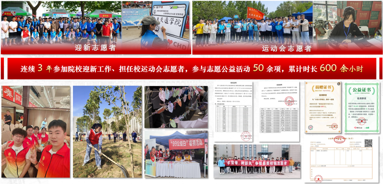 入学以来,她参与了50余项志愿公益活动,始终以热忱与责任书写自己的青春志愿篇章。在校园疫情期间,她主动请缨担任抗疫志愿者近20次,用实际行动守护校园健康安全;连续3年参加迎新工作,为新生答疑解惑,提供周到的接待和服务;在植树节期间,她挥锹培土,提水浇苗,亲手为校园增添一抹新绿;她连续3年担任校运动会志愿者,为运动员和裁判组提供物资补给和支持;在员工社区中,她多次参加“校园劳动志愿者”等活动,让“志愿红”成为照亮校园的一抹青春亮色。同时,她作为“点亮微心愿”“善行一百”等募捐活动的组织者和参与者,用实际行动关注需要帮助的群体。