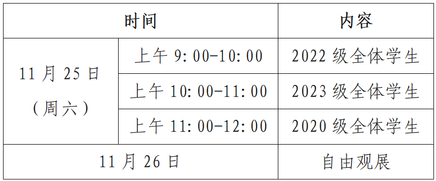 公司统一制作海报展出,11月25日(本周六)上午将进行海报集中评审,2021级全体同学到场进行现场解说,专业评审分组进行打分,其他年级同学作为大众评审现场打分,本次海报展分批分时段参展,具体日程安排如下: