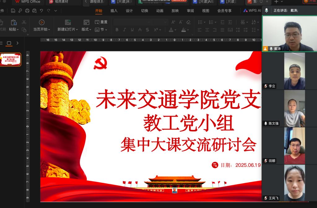 6月16日,未来交通党支部全体党员参加了公司组织的党员基本培训第一次集中大课,认真学习了教育部党组书记、部长怀进鹏所作的专题辅导报告。为进一步巩固学习成效、推动思想入脑入心,未来交通党支部高度重视、精心组织,结合实际工作特点,按照专任教师、行政管理、研究生、本科生四个党小组,于6月19日和6月23日分别组织开展了以“立足岗位勇担当,共筑教育强国未来”为主题的交流研讨活动。四个党小组全体党员积极参与,实现了人员全覆盖、思想全动员,营造了浓厚的学习交流氛围。